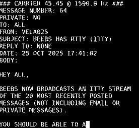 BeeBS now publishes the latest 20 messages as an RTTY/ITTY feed. It's updated nightly (manually at the moment until I write the cron job). You can access the feed at